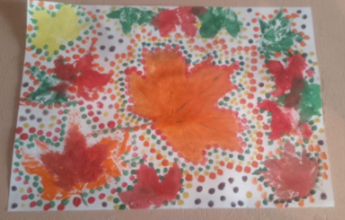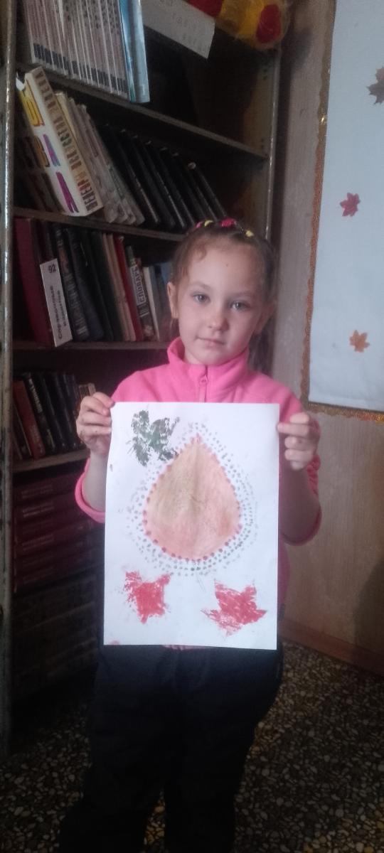 Библиотекарь рассказала об этой интересной технике детям и они приступили к рисованию, используя ватные палочки. Также познакомились с техникой оттиска, когда на рисунок накладывали осенние листья.