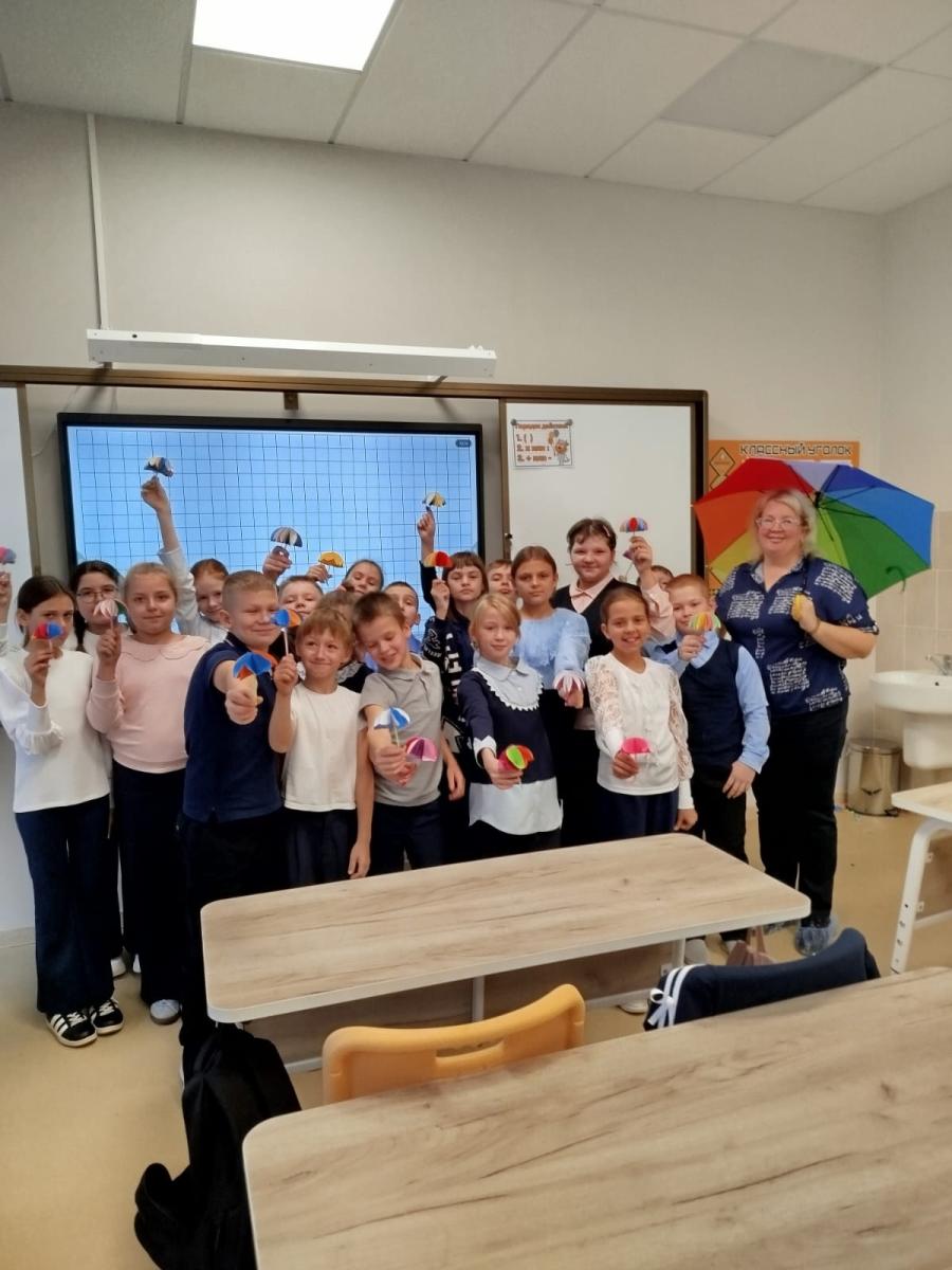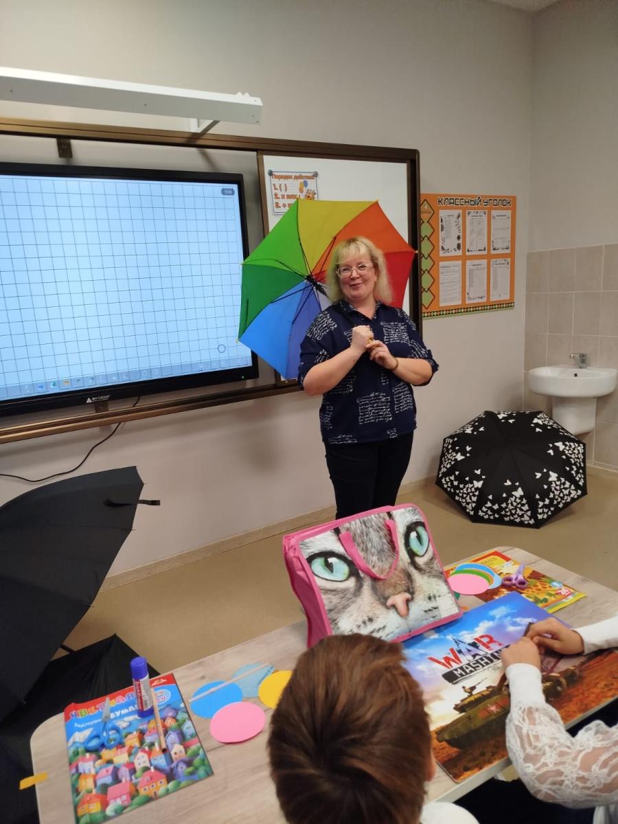 Ирина Николаевна принесла с собой много разных зонтиков: от огромноного зонта-трости, под которым смог спрятаться весь класс, до крохотного, котрый используется для оформления напитков. Удивил школьников изонт, нана куполе которого от дождя проявляются и становятся цветными рисунки. Но выбрали для образца поделки самый веселый разноцветный зонтик, потому что он яркий и радует глаз.
