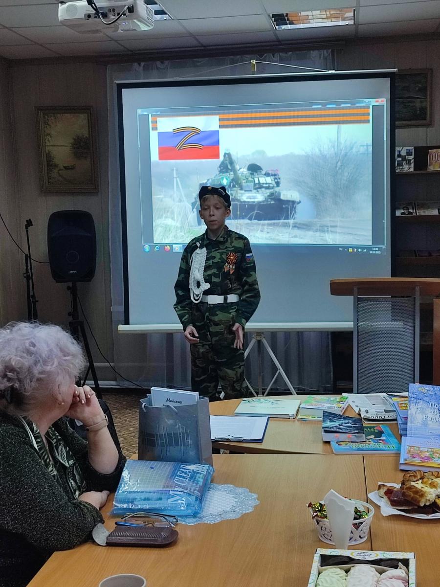 А зрителей порадовало выступление молого участника встречи Харин Д., который проникновеннно прочитал стихотворение Г.Тороповой, посвященное ребятам с СВО. С Галиной Васильевной у них уже сложился творческий тандем и они часто выступают вместе. В свои 13 лет Денис победил уже не в одном литературном конкурсе, а под крылом такого наставника его ждет еще больше успехов.